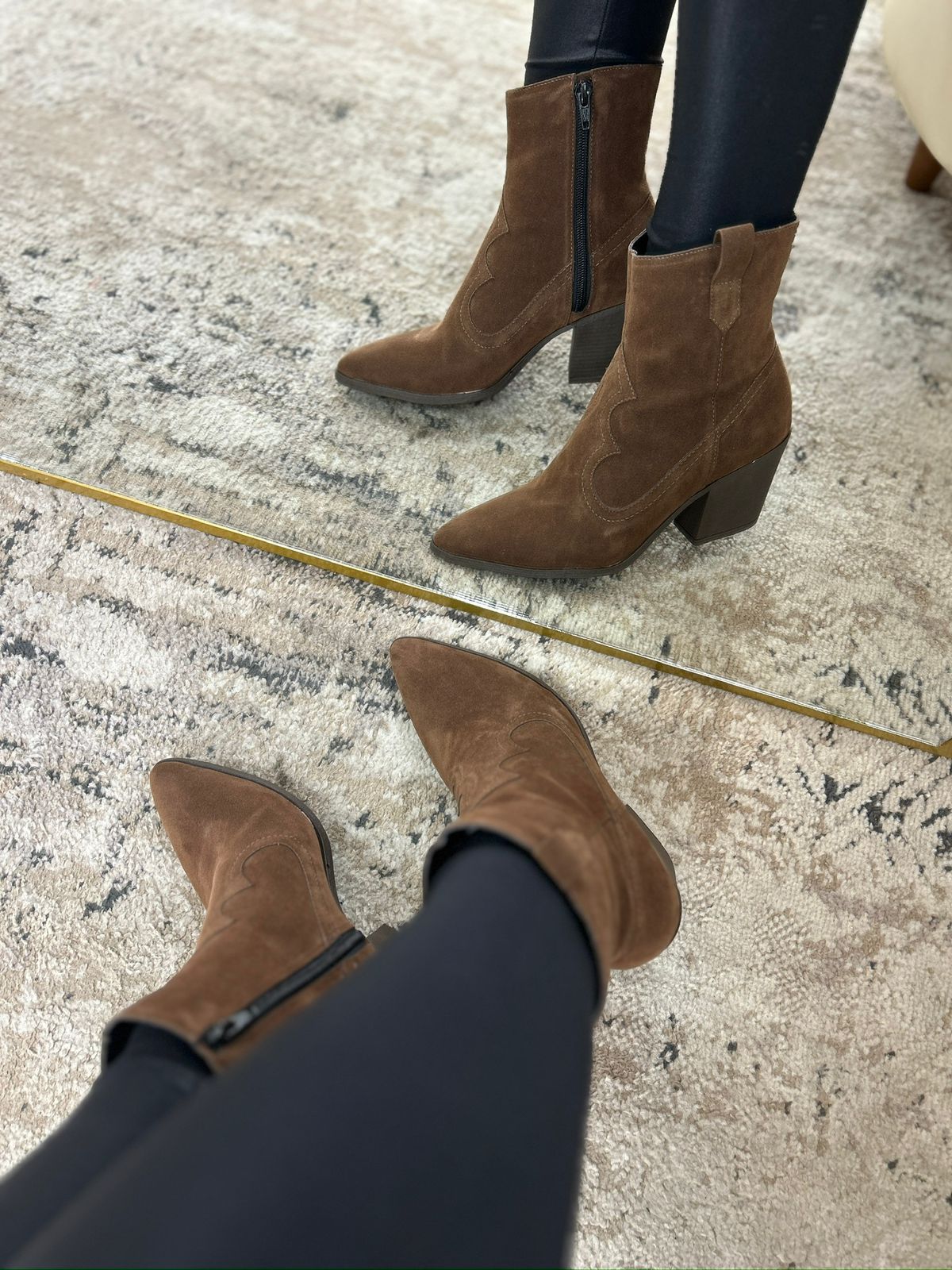 A bota Western que você não vai querer tirar do pé! Unindo a tendência country com um toque urbano, este modelo é confeccionado em camurça de alta qualidade, garantindo um visual "soft" e elegante. O acabamento conta com costuras ornamentais clássicas que reforçam a identidade do estilo boho chic.