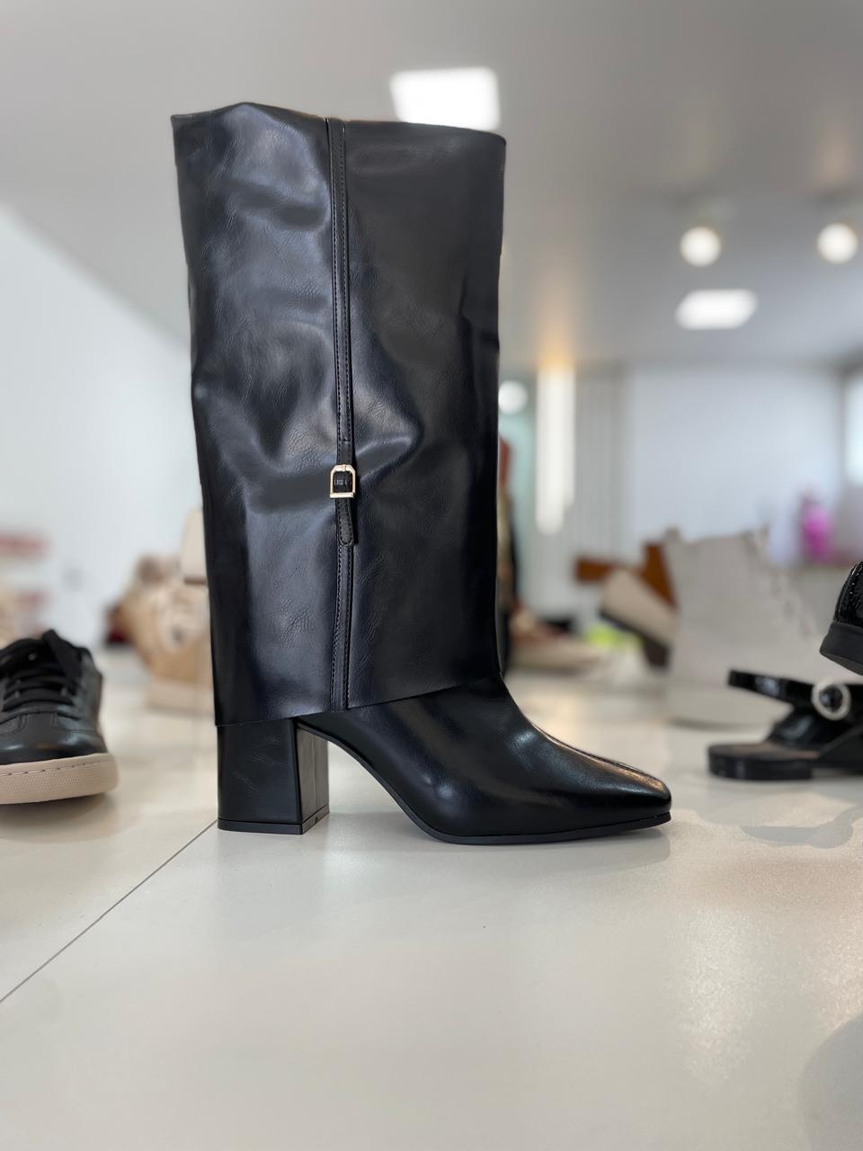 Eleve seu visual com a bota Melissa. Com um design inovador de cano estruturado e sobreposição dobrável, este modelo une a ousadia das passarelas com a versatilidade do dia a dia. Seu bico levemente quadrado e o salto bloco garantem um caminhar estável sem perder a elegância.