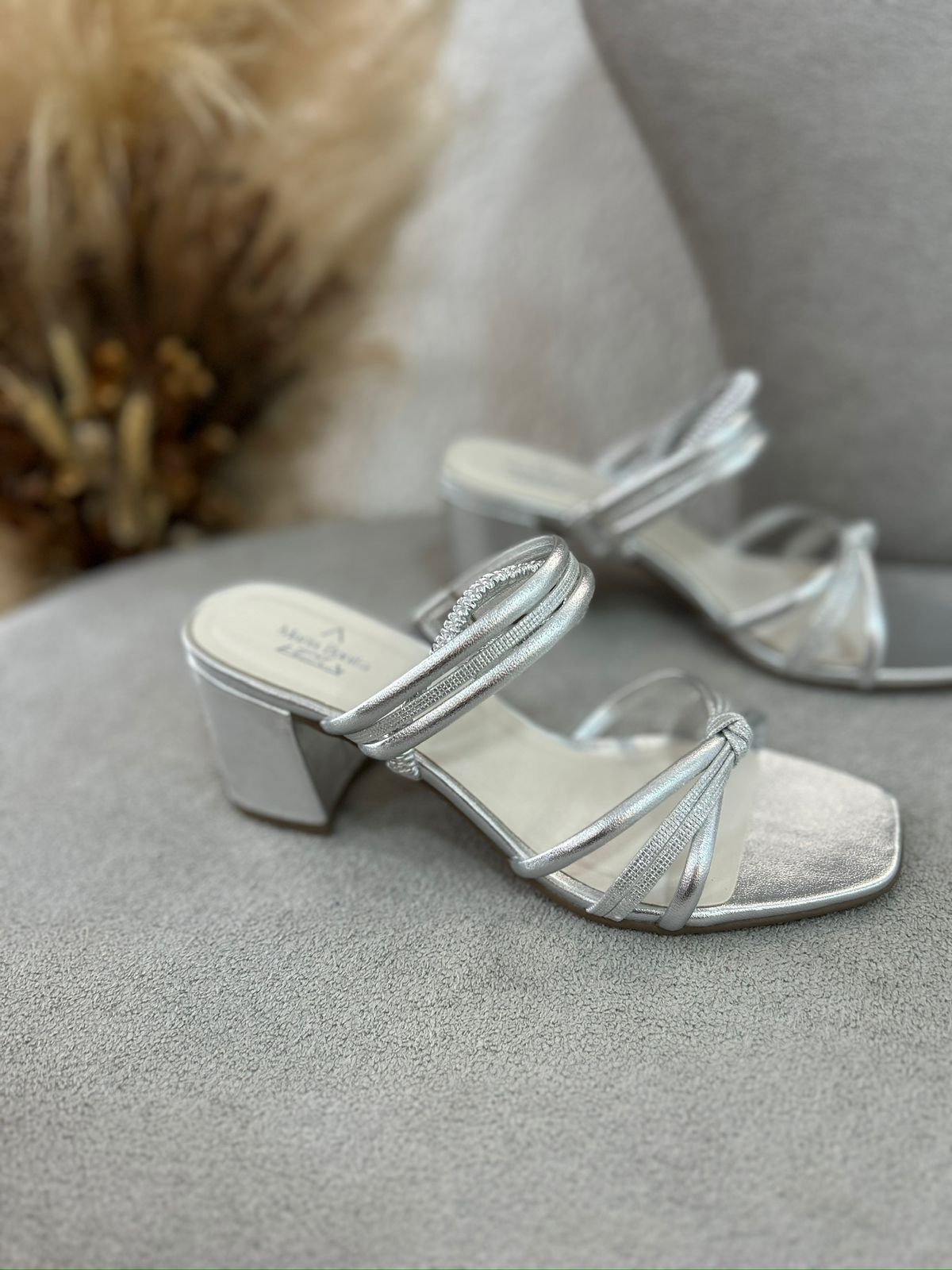 Esta sandália é a peça que faltava no seu guarda-roupa! Ela combina a elegância do acabamento metalizado prateado com o conforto e a segurança do salto bloco baixo. Um modelo versátil, ideal para brilhar em eventos sem abrir mão do bem-estar. Modelo 2 em 1, pode ser usada como tamanco ou sandália