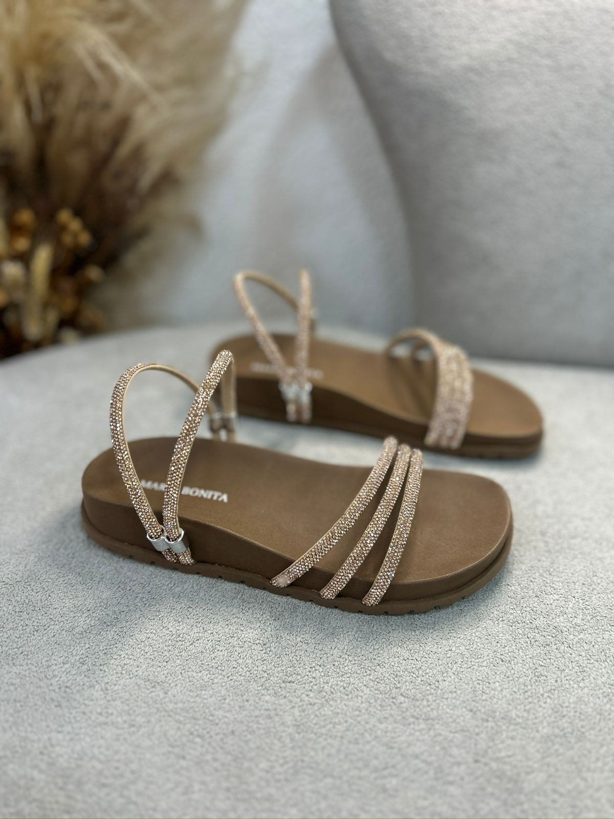 Apresentamos a Sandália Iara que combina a leveza do solado anatômico com o charme cintilante do strass em tom Rosé Gold. É a escolha perfeita para quem deseja adicionar um toque de glamour discreto e muito conforto a qualquer look.